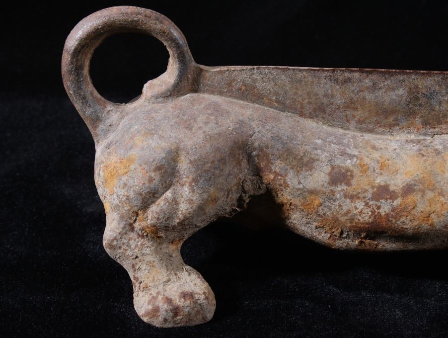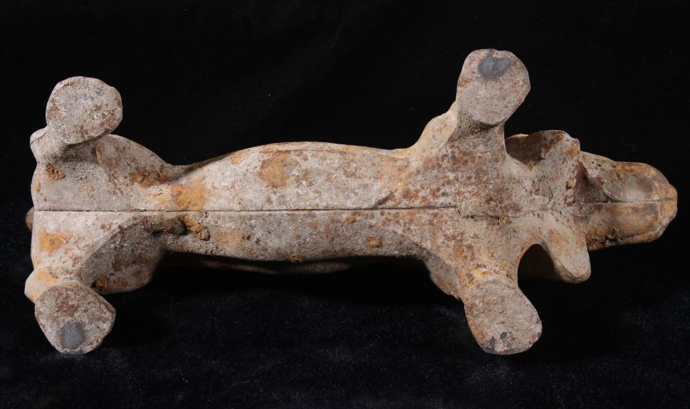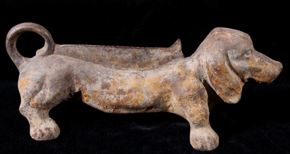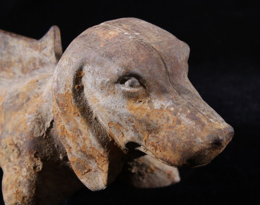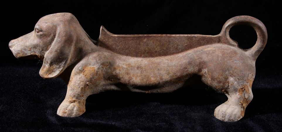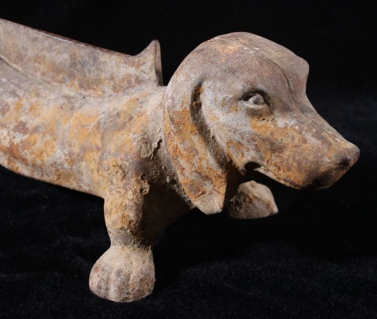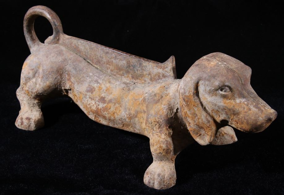 Offered in this lot we have a cast iron dachshund boot scraper originating from the mid 20th century. The piece is made of cast iron and is made in the likeness of a Dachshund. The shoe or boot scraper shows sturdy and simple construction with a scraping bar along the dogs back. The boot scraper is free of manufacturers marks with a welding seam across the piece length wise. The piece shows good condition for its age with some uniform rust across the piece. It measures 12 1/2" long by 5 1/4" wide and 4 3/4" tall.