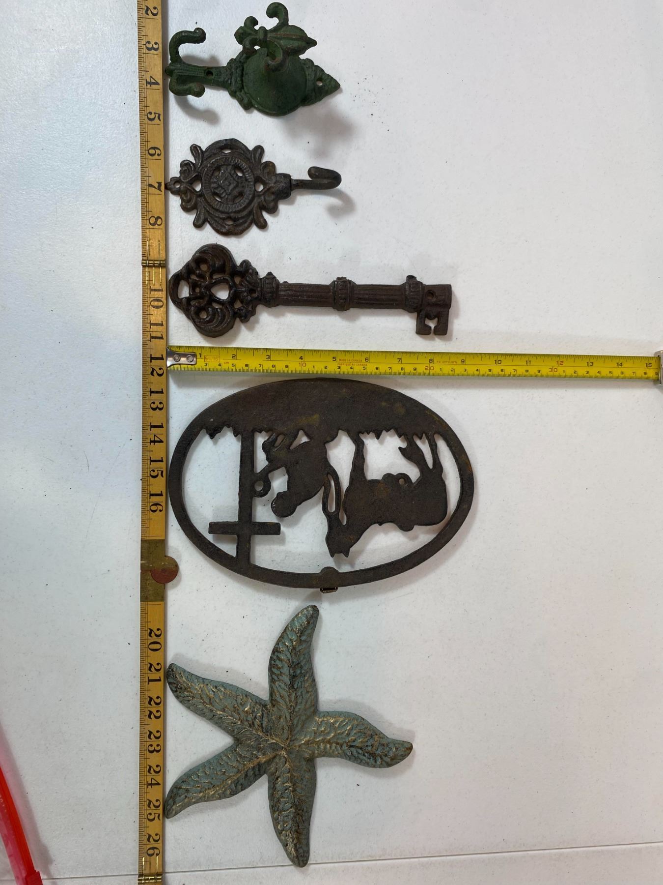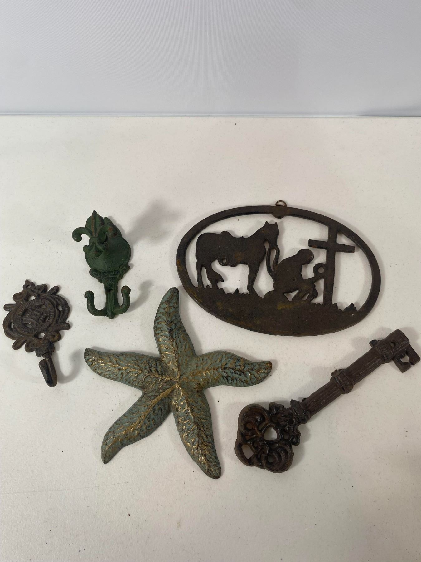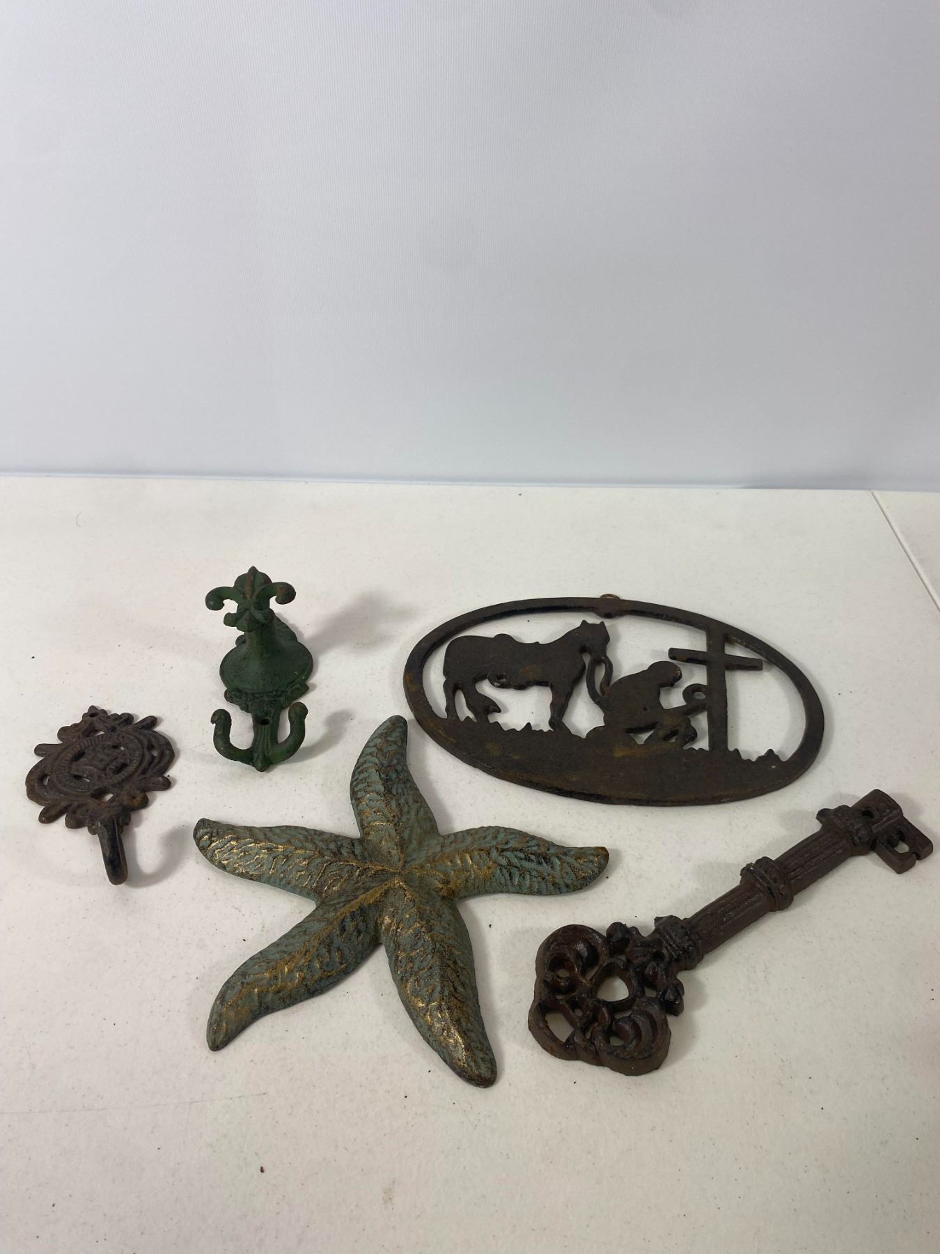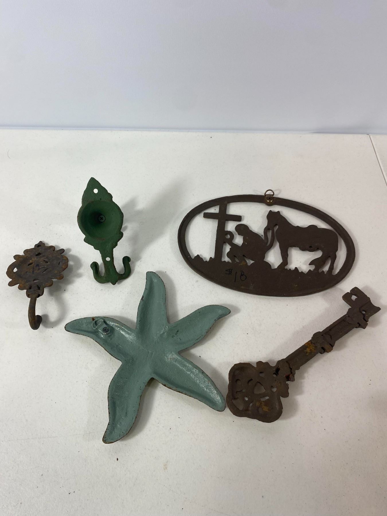 Assortment of cast iron items including a starfish plaque, skeleton key, wall hooks, and an oval horse-and-cross scene. - Mixed coastal and Western themes - Painted and patinated finishes - Surface rust and age wear consistent with use