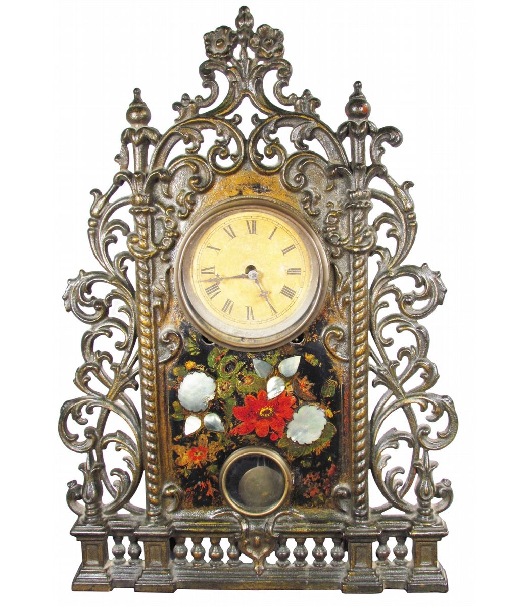 Cast Iron Eight Day Mantle Clock. Hand painted dial with mother of pearl inlay. Comes with pendulum. Excellent condition. 14 1/2 X 22 X 4 inches.