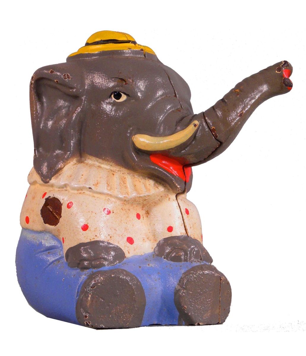Cast Iron Elephant Still Penny Bank. Excellent condition. 3 3/4 inches tall.