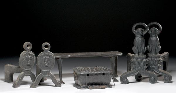 American or English, late 19th century. Includes two pairs of andirons, seated spaniels and eagles, a warming bench and a basket-form ash receiver. Spaniels are 13.75" high; warming bench is 6.25" high x 19" long.