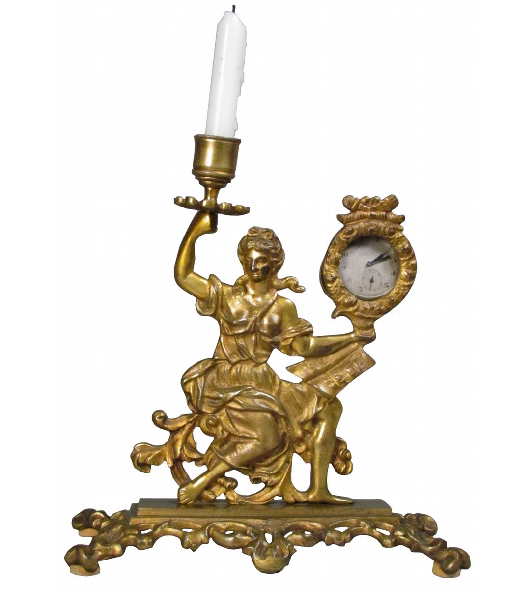 Cast Iron Figural Candle and Pocket Watch Holder. Very good condition. 9 X 9 3/4 X 4 1/4 inches.