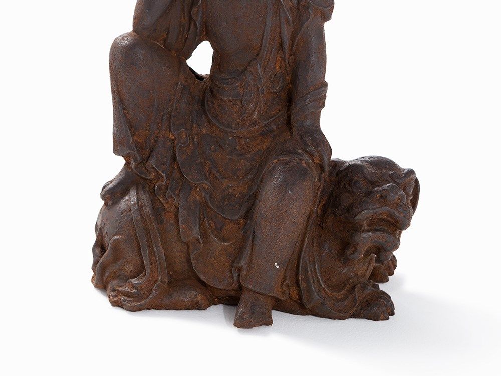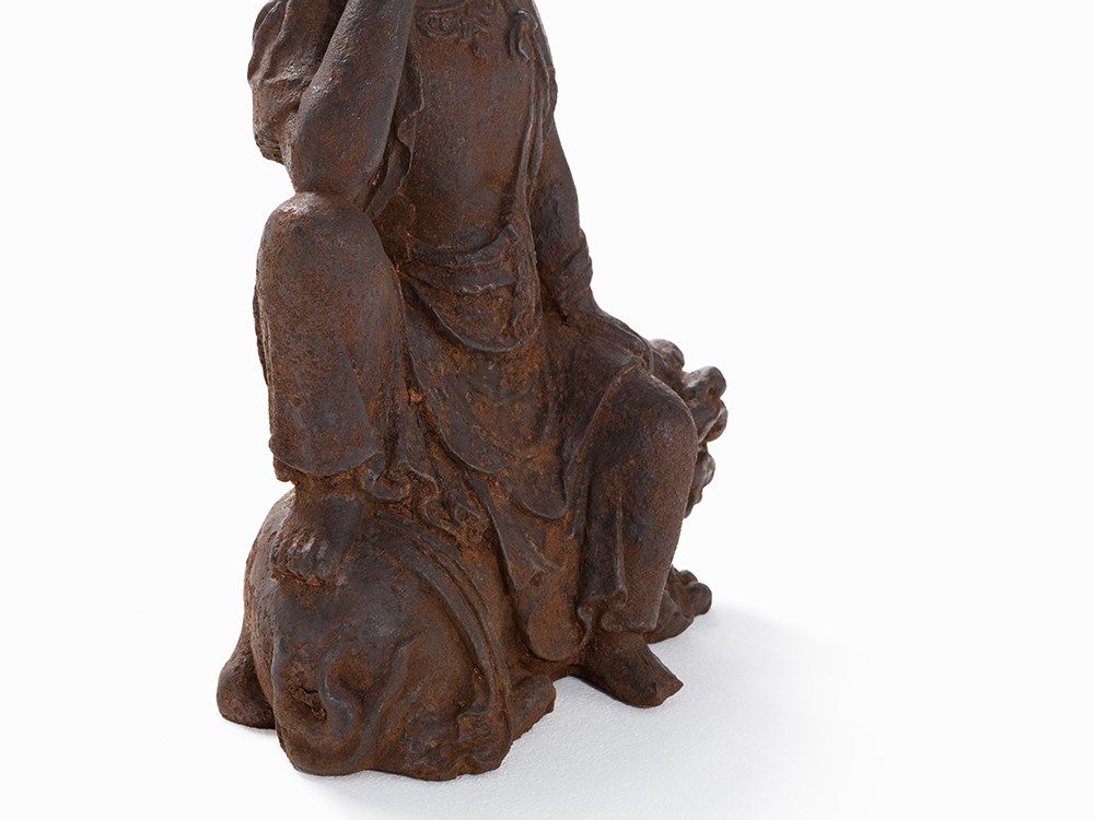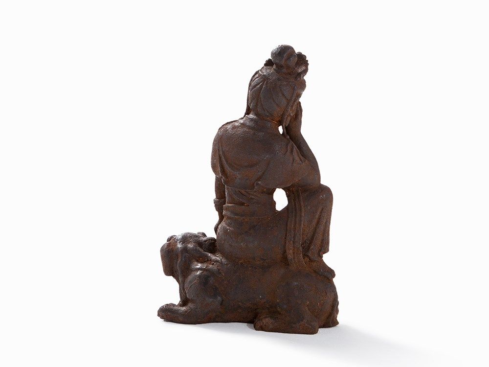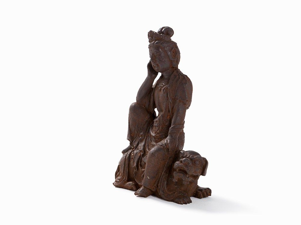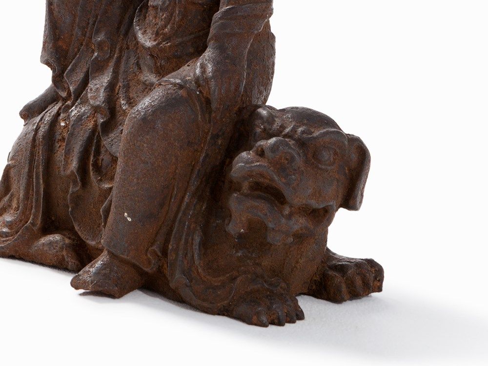 Cast Iron Figure of a Guanyin Seated on a Fo Lion, 18th/19th C.