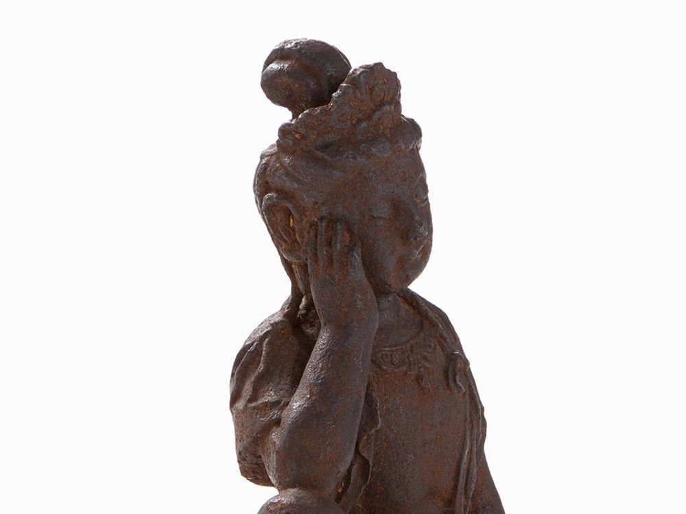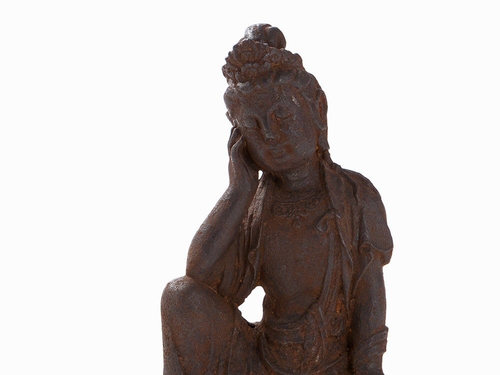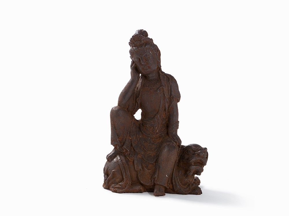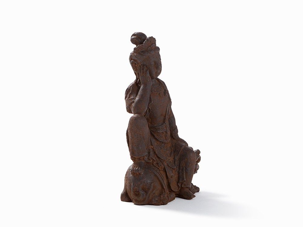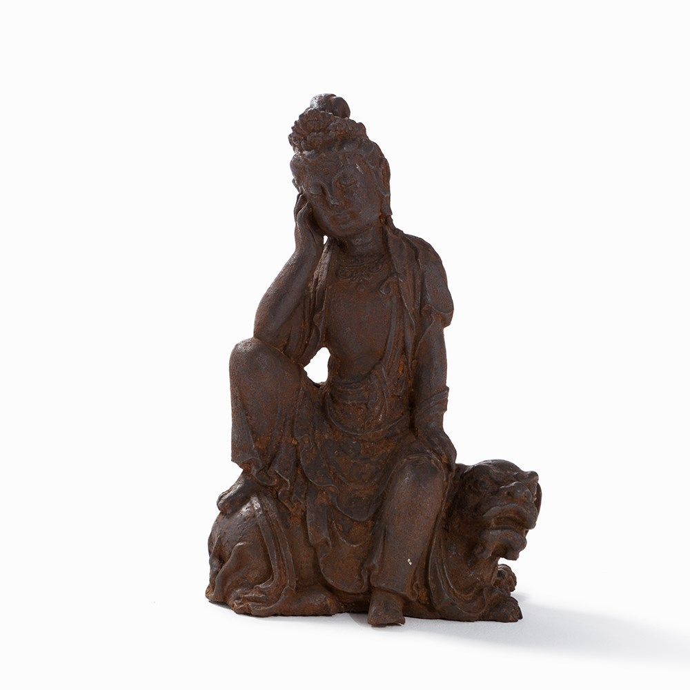 Cast Iron Figure of a Guanyin Seated on a Fo Lion, 18th/19th C.