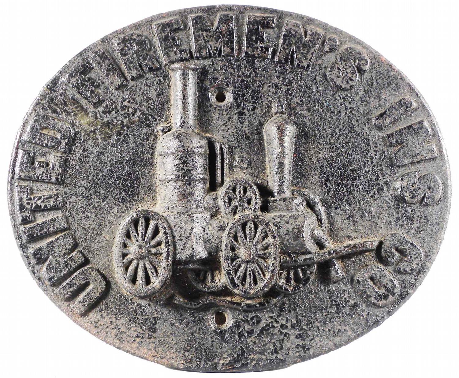 Cast Iron Fire Mark. Issue of 1868. Plain edge. Name of company spelled out in full in raised letters, "United Firemen's Ins" Company of Philadelphia. Engine wheel has twelve spokes in contrast to eight of the previous issues. Good original condition. 11 1/2 X 9 1/2 inches.