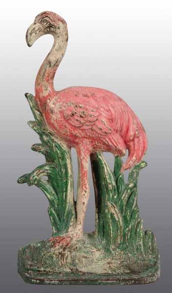 Description Made by Hubley, cat. #450. Full-figure with realistic depiction of a flamingo standing amongst reeds. One of the rarer forms of doorstop produced by Hubley. Very good. 700-1000 Condition (Very Good). Size 10 - 1/2” x 5 - 1/2”.