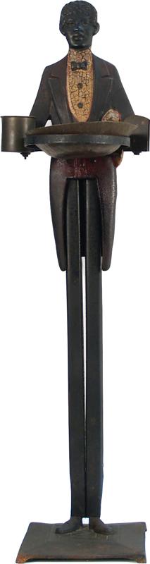 Cast-Iron Floor Model Figural Black Butler Ashtray Stand w/ match cup holder & match book holder, black jacket - 35" tall