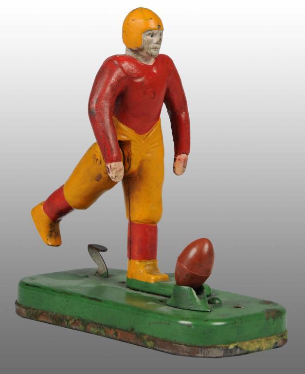 Description American. Red and yellow figure with green base. Original hard rubber football is struck by leg when lever is pressed. Some spots of pitting to metal on the base with minor chipping to figure. Condition (Excellent). Size 8 - 1/4" T.