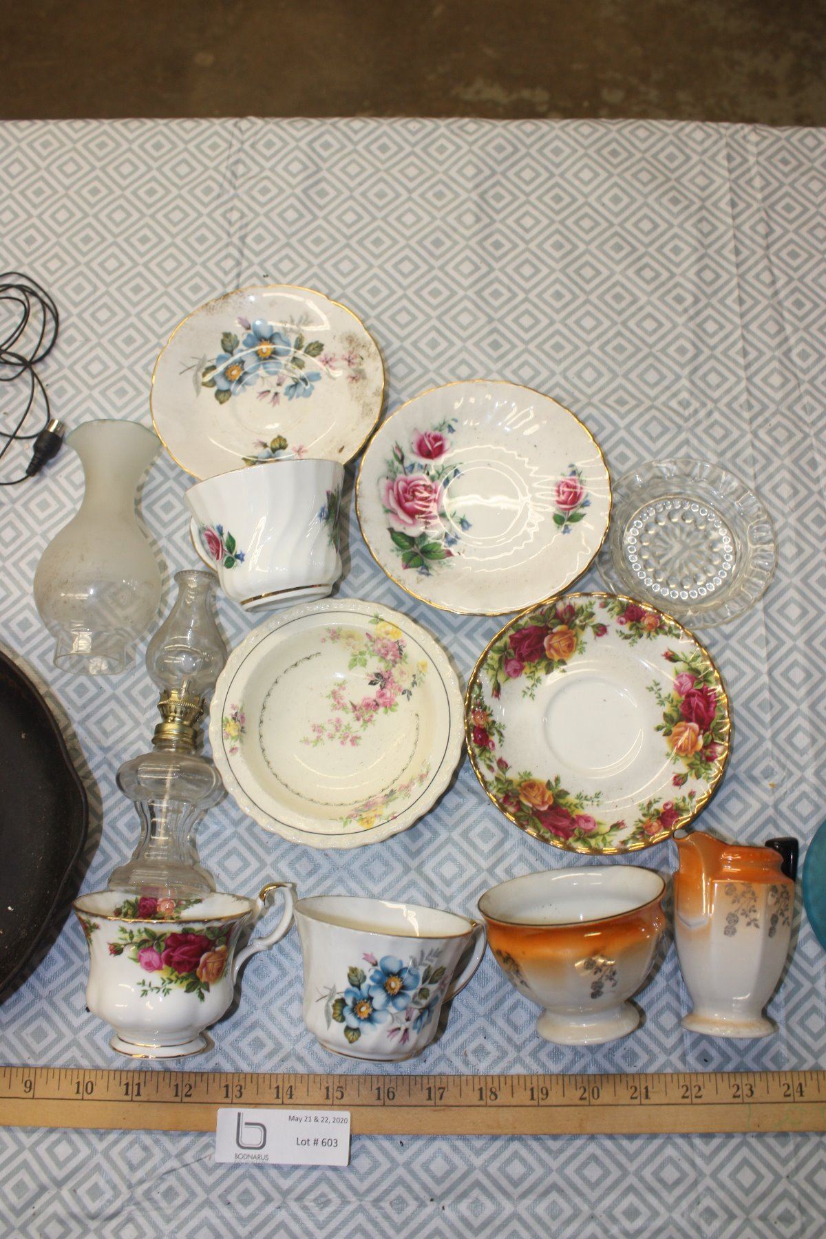 Cast Iron Frying Pan, Blue Dish and Misc Dishes