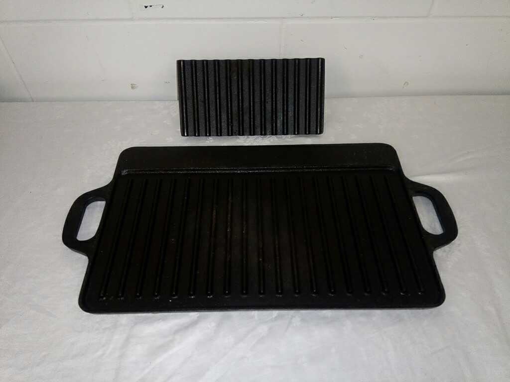 Pre-owned 17x9" Cast Iron Griddle, 2-sided, plus bonus 4x8" cast iron press. Fair condition, with a few small spots of rust. Can be cleaned up.