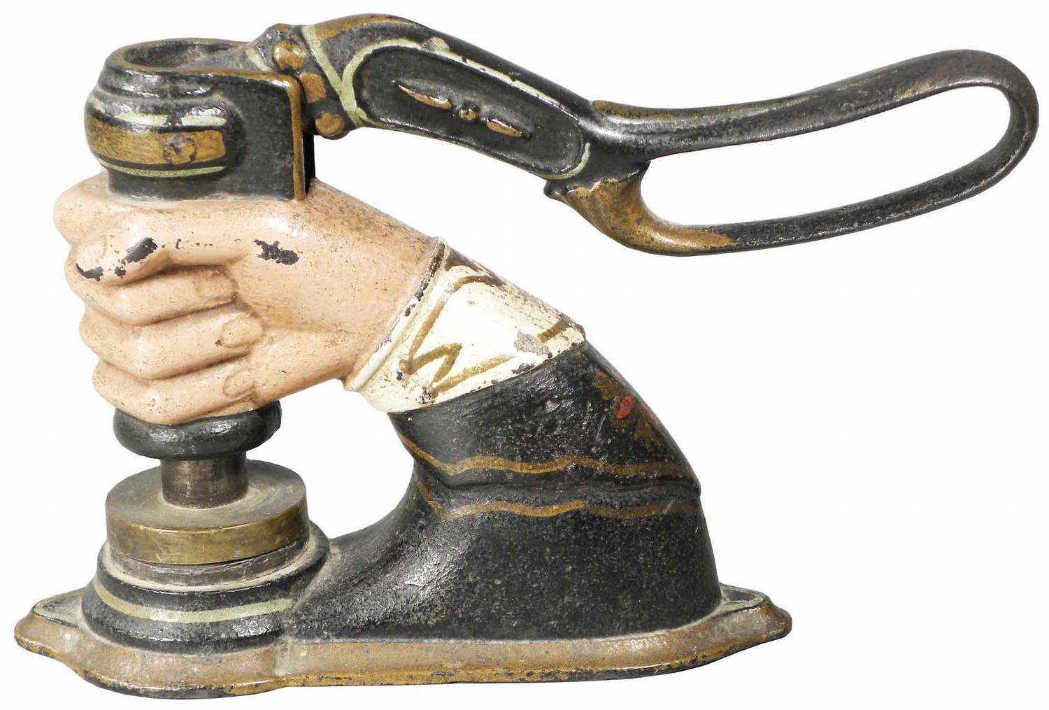 Cast Iron Hand Stamp. Nicest one we have ever seen with original paint. Stamp illegible otherwise excellent condition. 8 X 5 3/4 X 2 3/4 inches.