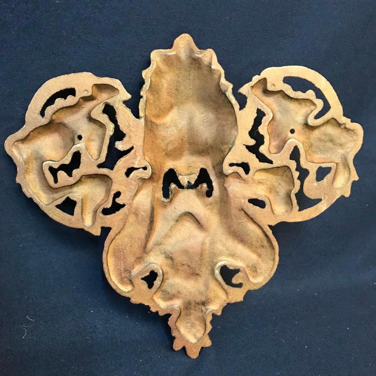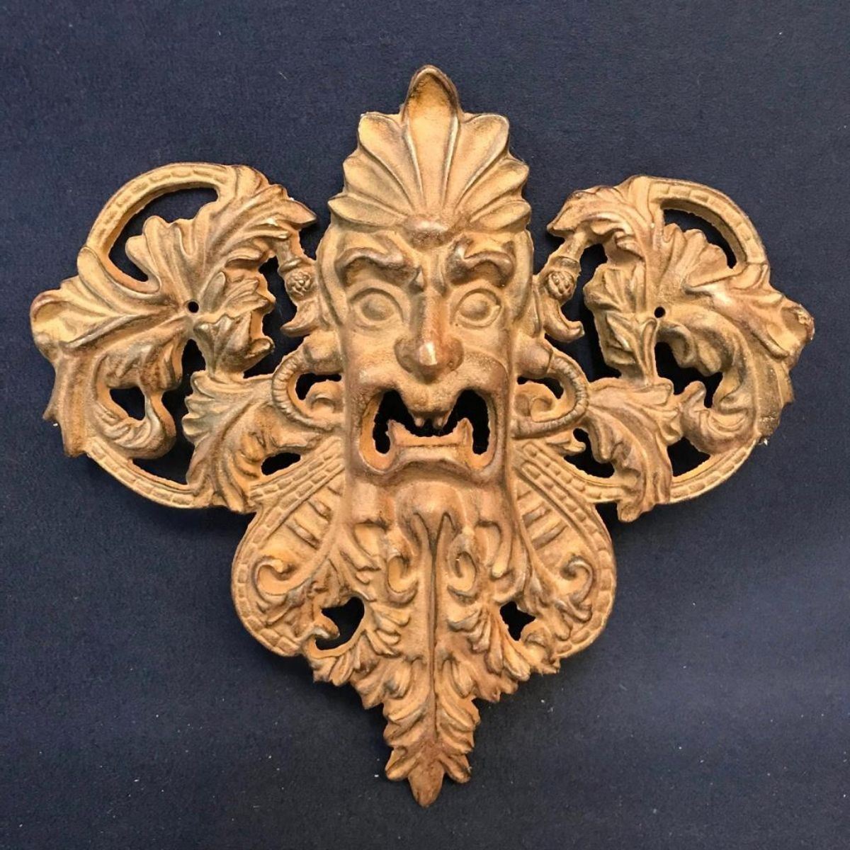 Vintage cast iron hanging gargoyle face. 14" H X 15" W. **there are holes drilled on each side of the face for hanging.Â