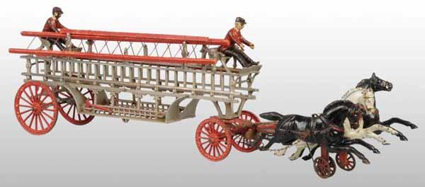 Description Harris nickel-plated ladder wagon pulled by a three-horse Dent front. Lot includes three ladders and two figures. Rear is broken and toy has been repaired, re-nickeled, and repainted. Condition (Repaint). Size 30" L.