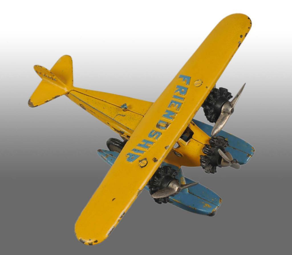 American. Yellow with blue trim. Missing one front wheel and hub. Airplane Cast Iron Toys Condition (Near Mint). Size 13" W.