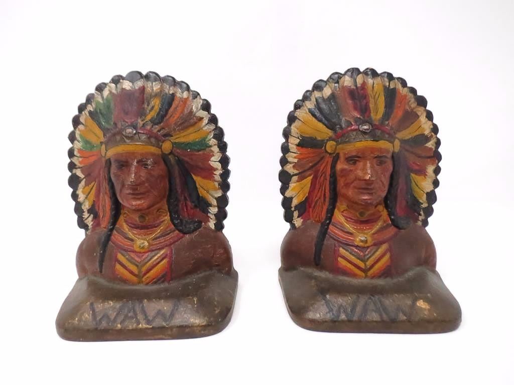 Cast Iron Indian Chief Doorstops complete original paint 6x4.5x3 inches. "WAW" marking