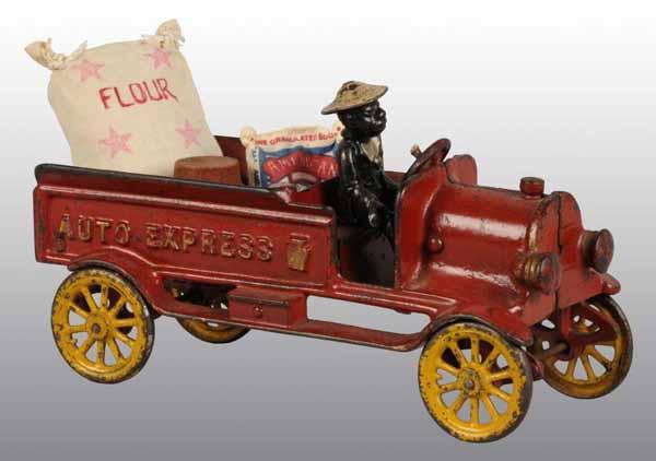 Description Embossed "Auto Express" on both sides. Includes yellow spoked wheels, original African American driver, and bags of flour and hogwash. Some minor to moderate paint loss, mostly on underside of tin bed and wheels. Condition (Very Good - Excellent). Size 9" L.