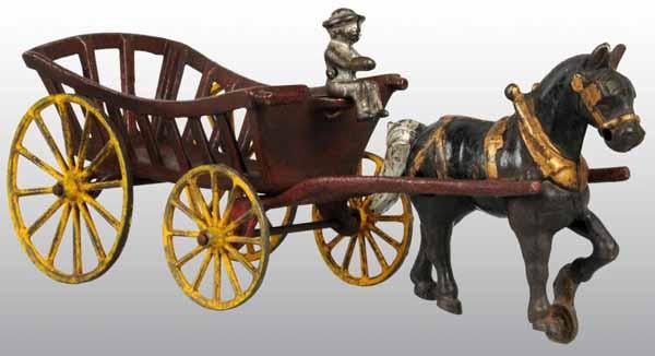 Description Pulled by a single black horse. The wagon and wheels are completely repainted. Condition (Repaint). Size 13 - 1/4" L.