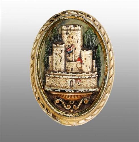 Description Made by Hubley and numbered "680". Lovely portrayal of castle in the woods. Condition (Excellent). Size 4" x 3".