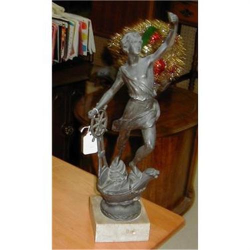 Cast Iron man on a ship at the wheel on a base (not sure what it is). The base is 4" square and may need cleaning. He looks like he is wearing a Greek outfit. He is missing a spear, but this does not detract from its look. There are some scratches and marks in the metal. Buyer pays shipping and handling costs.