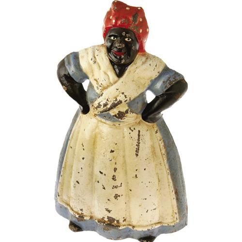 <B>Cast Iron Mammy Doorstop.</B></I> Possibly an unmarked Hubley product, this early 20th century 13.25" iron mammy is a formidable addition to any collection of Black Americana. Paint chips scattered throughout. Very Good condition. <BR><BR><B>Important not