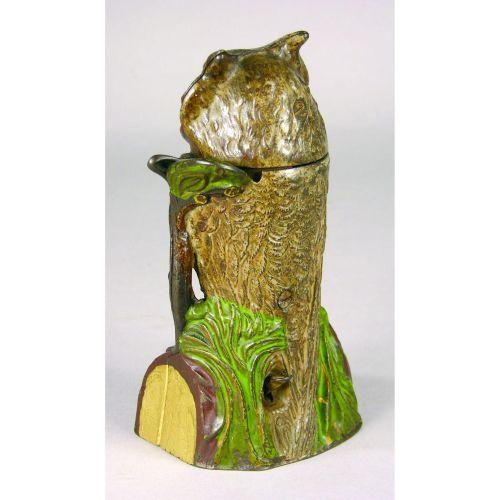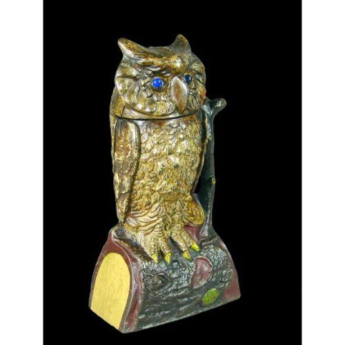 Cast Iron Mechanical Bank Owl. Patented 1888 with glass eyes. Missing the bottom tin door, otherwise, excellent original condition. 7 1/2 inches tall.