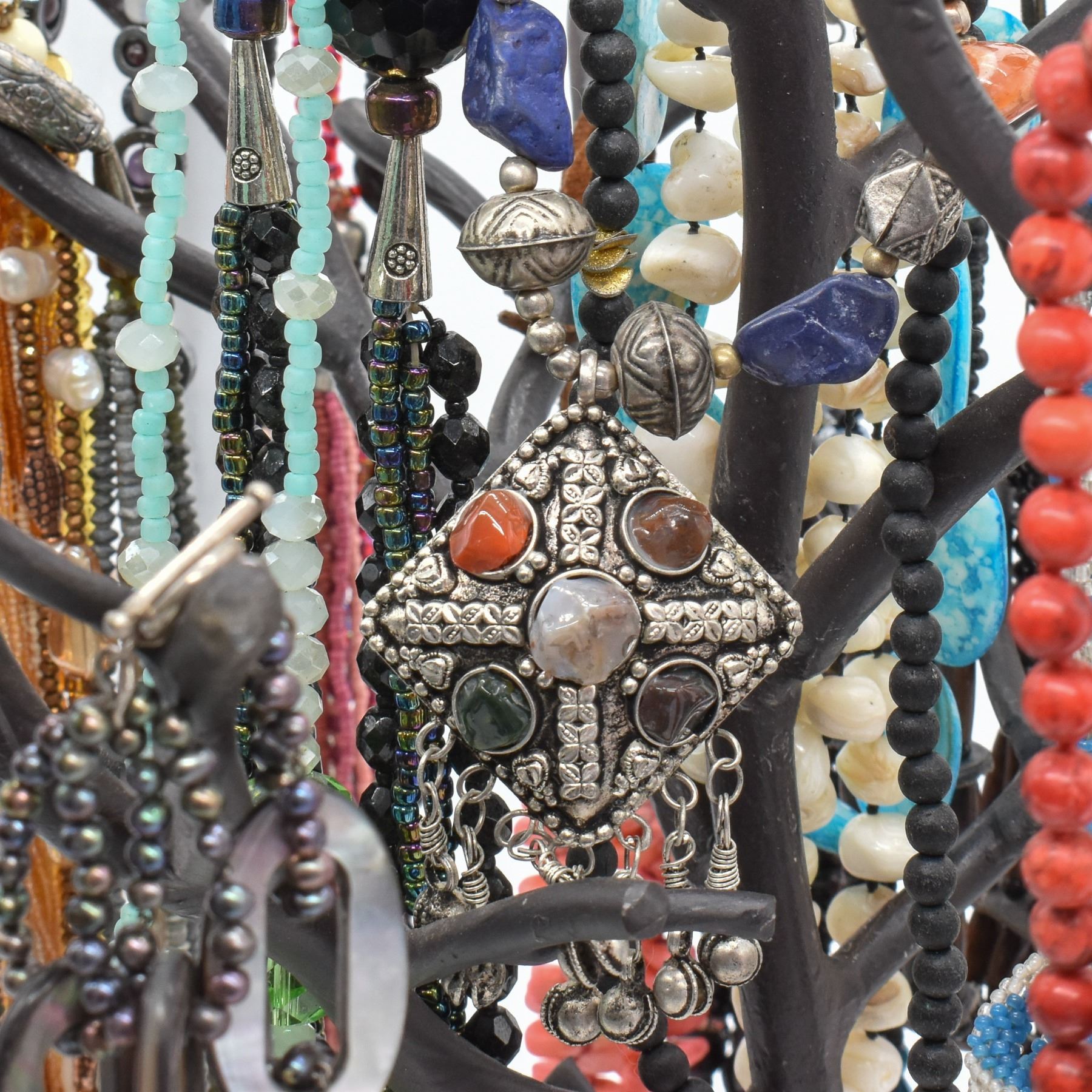 Cast Iron Metal Multi-Candleholder and 25+ Necklaces, most if not all of the necklaces are beaded by Kathy Kills Thunder, candleholder measures 22''H x 16.5'' x 17''