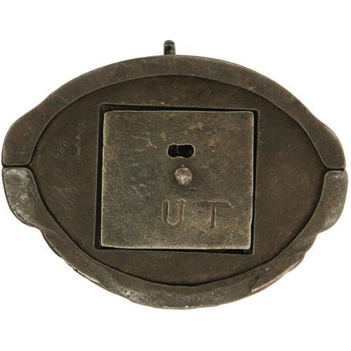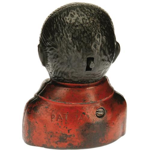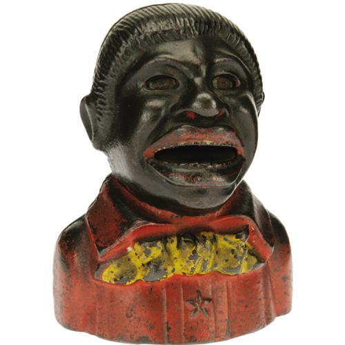 <B>Cast Iron Negro Bank.</B></I> A popular form in which coins are inserted into the mouth only to be swallowed when a lever is pushed. This splendid example relies on the iron's natural color for hair and flesh tones, while the shirt is red and accented by a yellow bow tie. 5.25" high. Wear to the bank's original paint is consistent with normal use. Mechanically sound and overall in very good condition. <BR><BR><B>Important