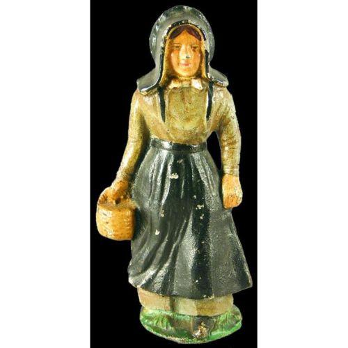 Cast Iron Quaker Woman in Bonnet carrying basket full body. Door Stop? Most original paint intact. Excellent condition. 8 1/4 inches tall.