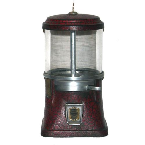 Cast Iron 1 Cent Nut Vendor with clear cylinder  measures approx. 6" x 6" x 12" tall.  Brass disc on flapper reads: Regal Products Co., Madison, Wisconsin.  Has a very attractive red/black finish that shows some wear along base edge and lock area.  A very attractive item.