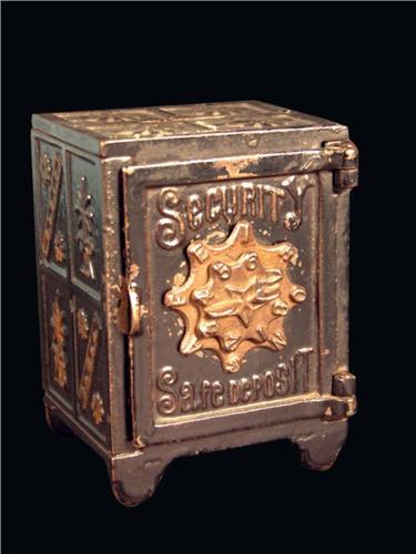 Cast Iron Security Safe Deposit Bank, marked 1887. Excellent condition. 2 3/4 X 4 X 2 1/2 inches.