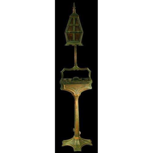 Cast Iron Smoking Stand with Lantern. Copper flashed hammered finish with slag glass light. Excellent condition. 54 inches tall.
