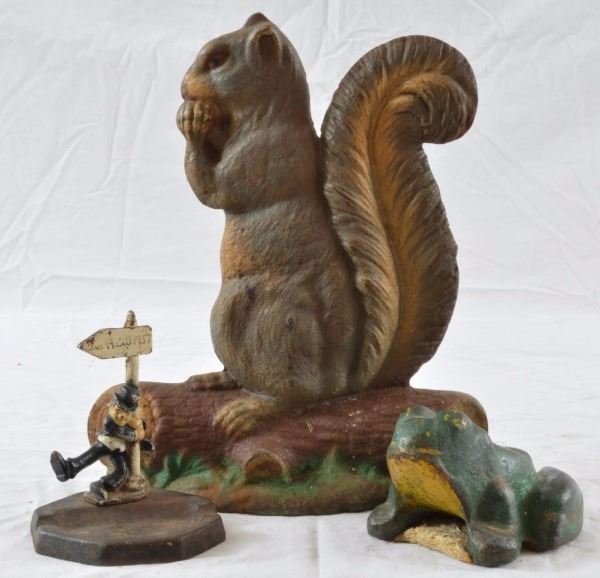 Cast Iron Squirrel Doorstop, Frog, and Ashtray