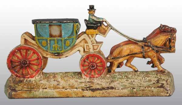 Description Made by Hubley, cat. #376. Wonderful depiction of team of horses trotting pulling stagecoach. Condition (Excellent). Size 6” x 11 - 1/2”.
