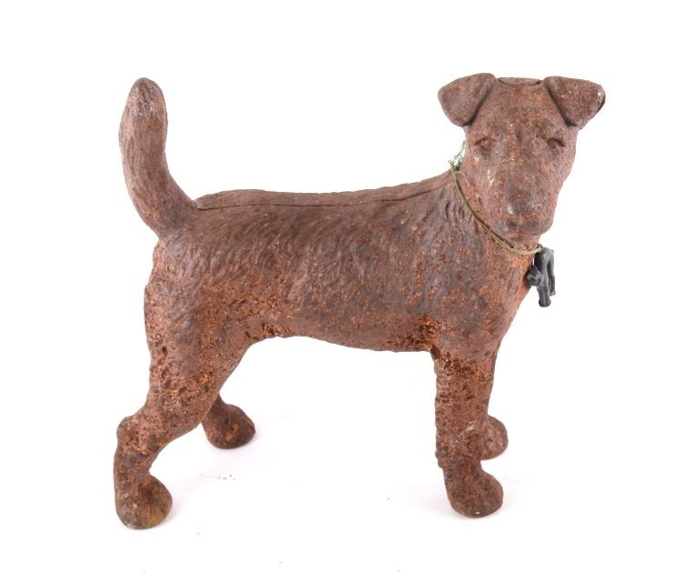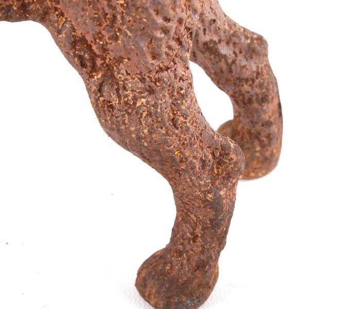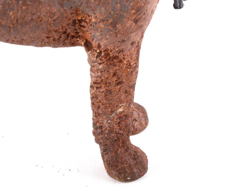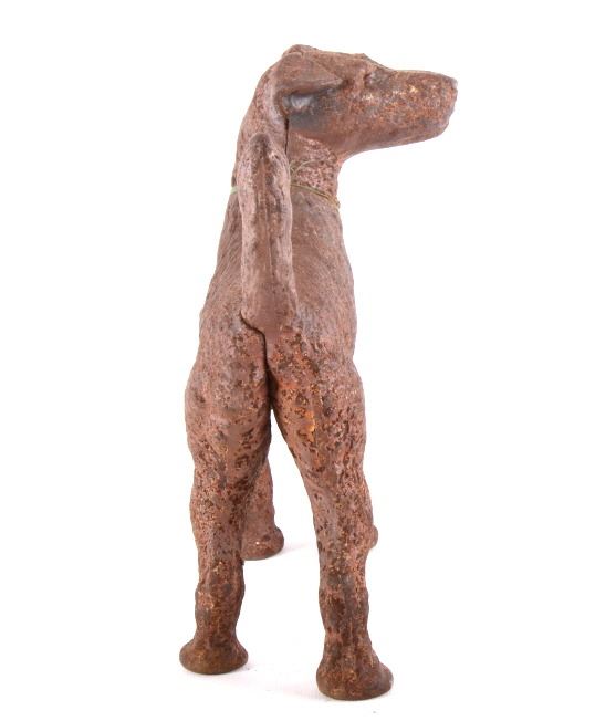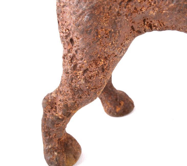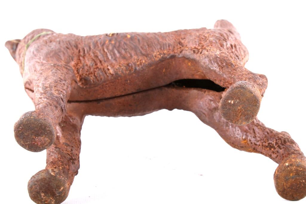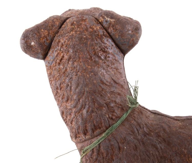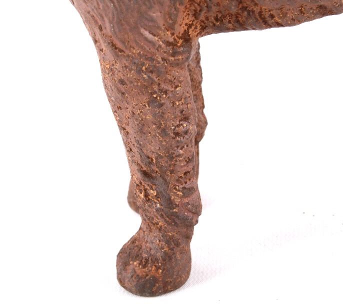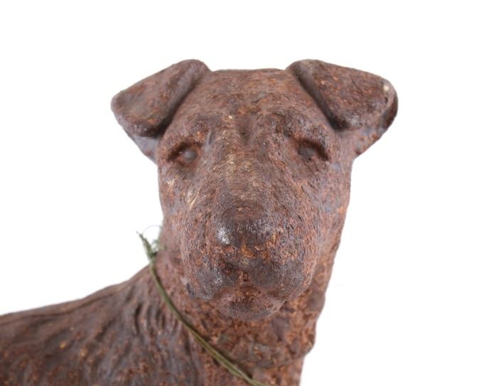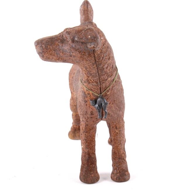 On this lot we have a beautiful rustic cast iron Terrier dog door stopper with a cat necklace around its neck. There is a good amount of detail on the body and face. When you look at the body you can see how the fur ripples and parts. The Terrier door stop has traces of rust from being out in the weather. Around the Terrier's neck there is a green string that is tied to a black cat. The inside of the dog is hollow. The dimensions for this dog are 8 ½” x 8 ¼” x 4”.
