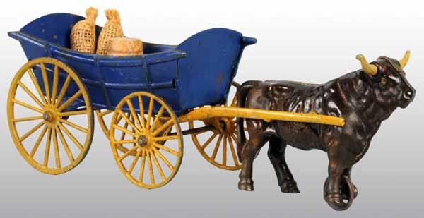 Description Pulled by a single oxen. Blue and yellow are repainted. Condition (Repaint). Size 13 - 1/2" L.