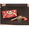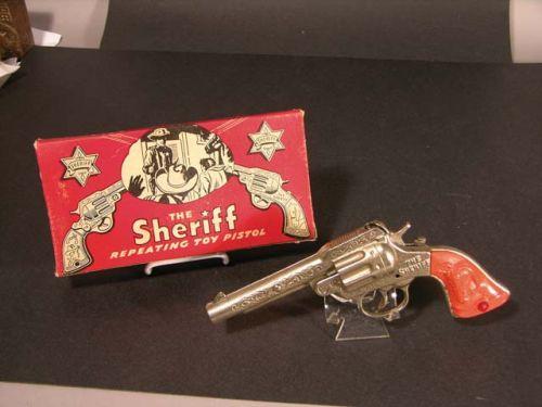 Cast iron toy cap gun "The Sheriff" repeating toy pistol by Stevens Co., Cromwell, CT in original box - red grips.