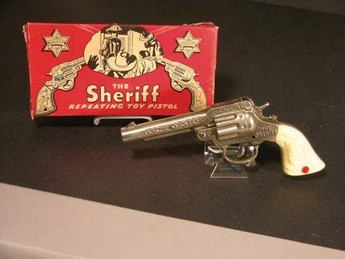 Cast iron toy cap gun "The Sheriff" repeating toy pistol by Stevens Co., Cromwell, CT in original box - white grips.