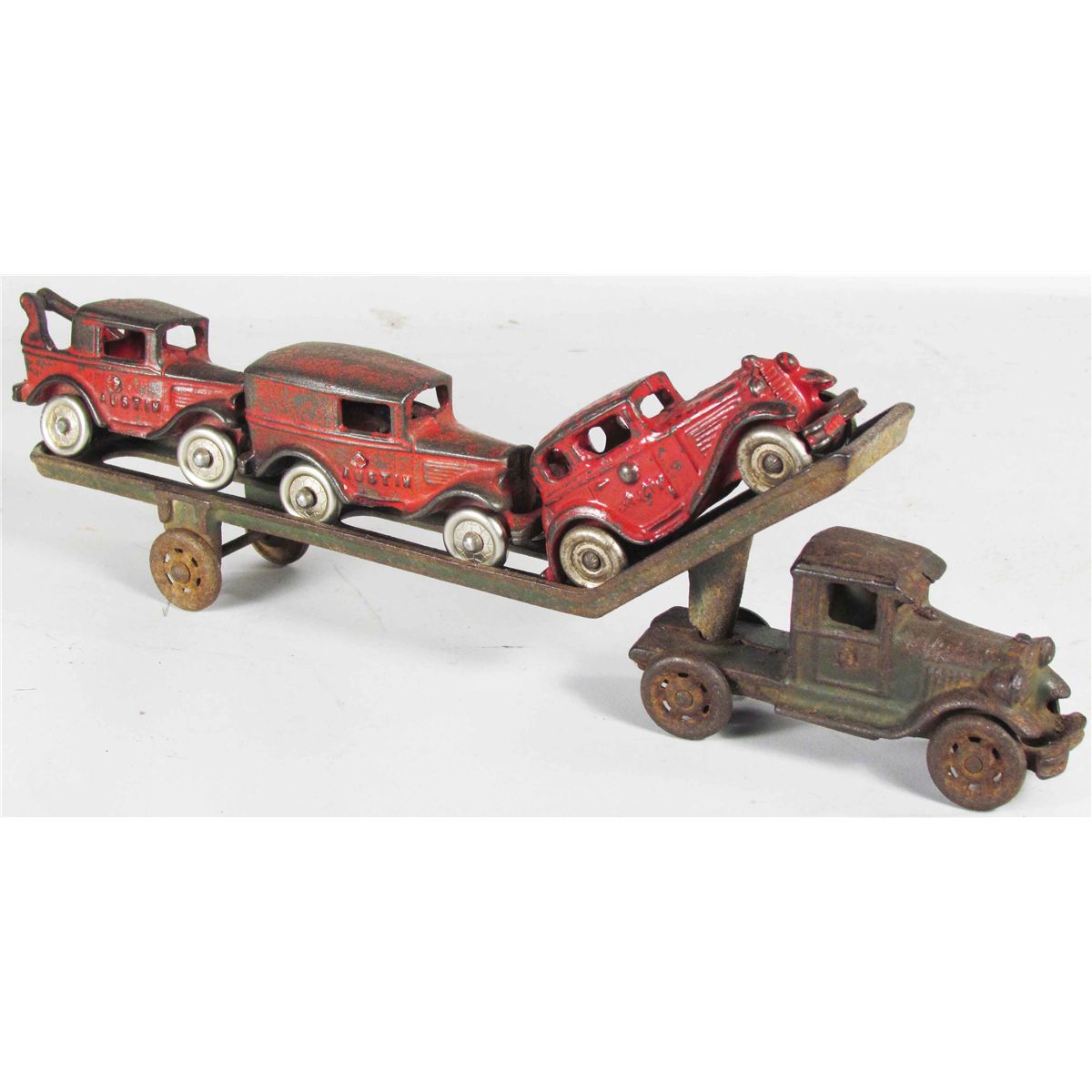 Cast Iron Toy Car Hauler. Green cab with green trailer. Comes with three vehicles. Rust and paint loss on cab and trailer. 12 1/4 inches.
