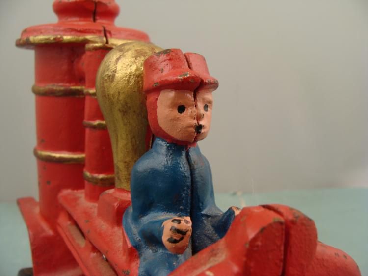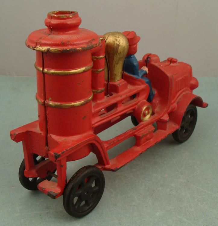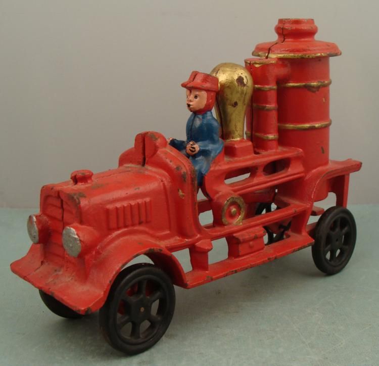Here is an older reproduction of a classic toy fire engine. It is all cast iron, painted red, gold and blue, with black metal wheels, measuring 11" long and 8 1/4" tall. The little boy fireman driver looks quite intent on reaching his destination. Even though one of the wheels is loose, it can stay on when sitting still. The truck is in very good condition overall, with a few light paint nicks. * This is a nice car for your cast iron toy or fire fighting collection.