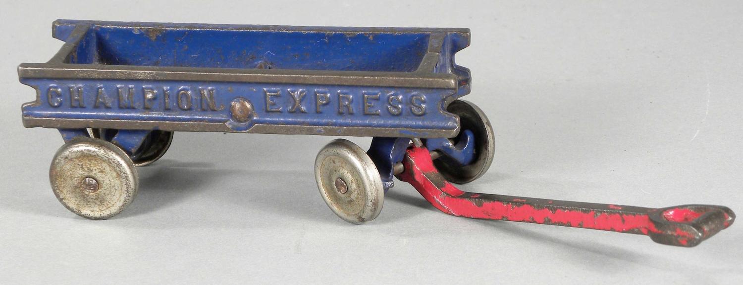 Cast Iron Toy Pull Wagon. "Champion Express". Most paint worn on handle otherwise very good condition. 4 5/8 inches long w/o handle. Start Price $50