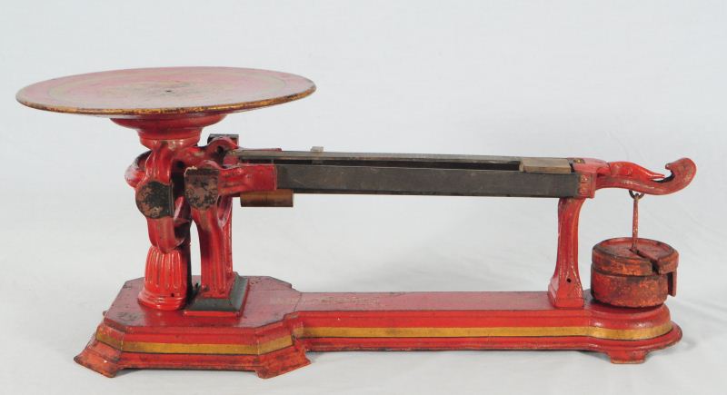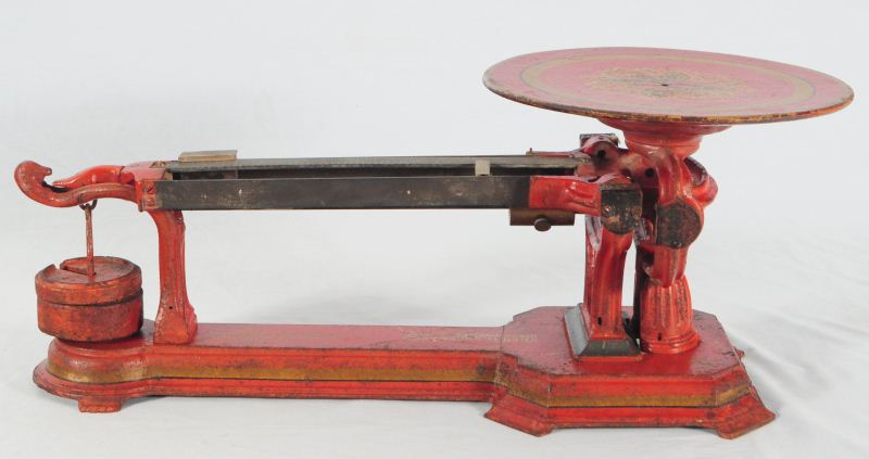 Cast Iron Henry Troemner Scale, Red Paint Hand Decorated & Stenciled, Cracked Base. Hand lettered for a Pennsylvania hardware store. Measures 26" W x 11" D x 10" H.