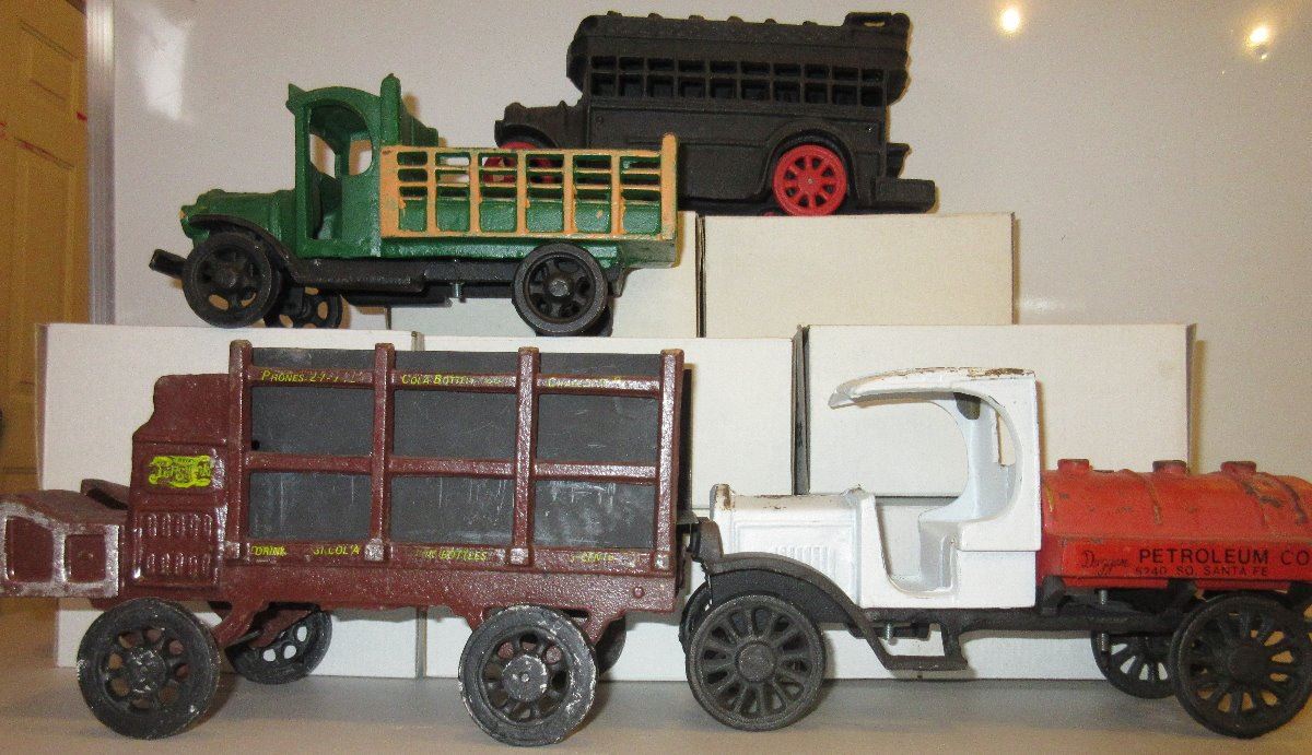 Two Delivery Trucks, one has Pepsi written on it, Cast Iron Bus and a Petroleum Delivery from Santa Fe Company