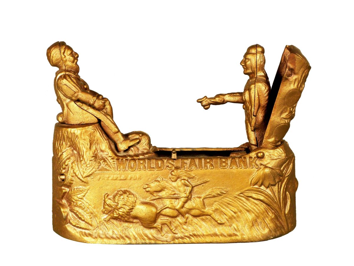 Cast Iron World's Fair Mechanical Bank. Depicting Pilgrim and Indian. Embossed Mayflower Ship and Indian, Horse and Buffalo on sides. Columbus reproduction of the original in collection of the book of knowledge. 8 inches long.