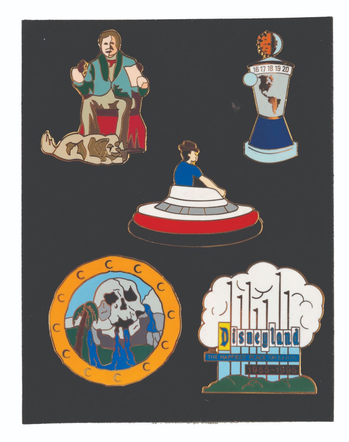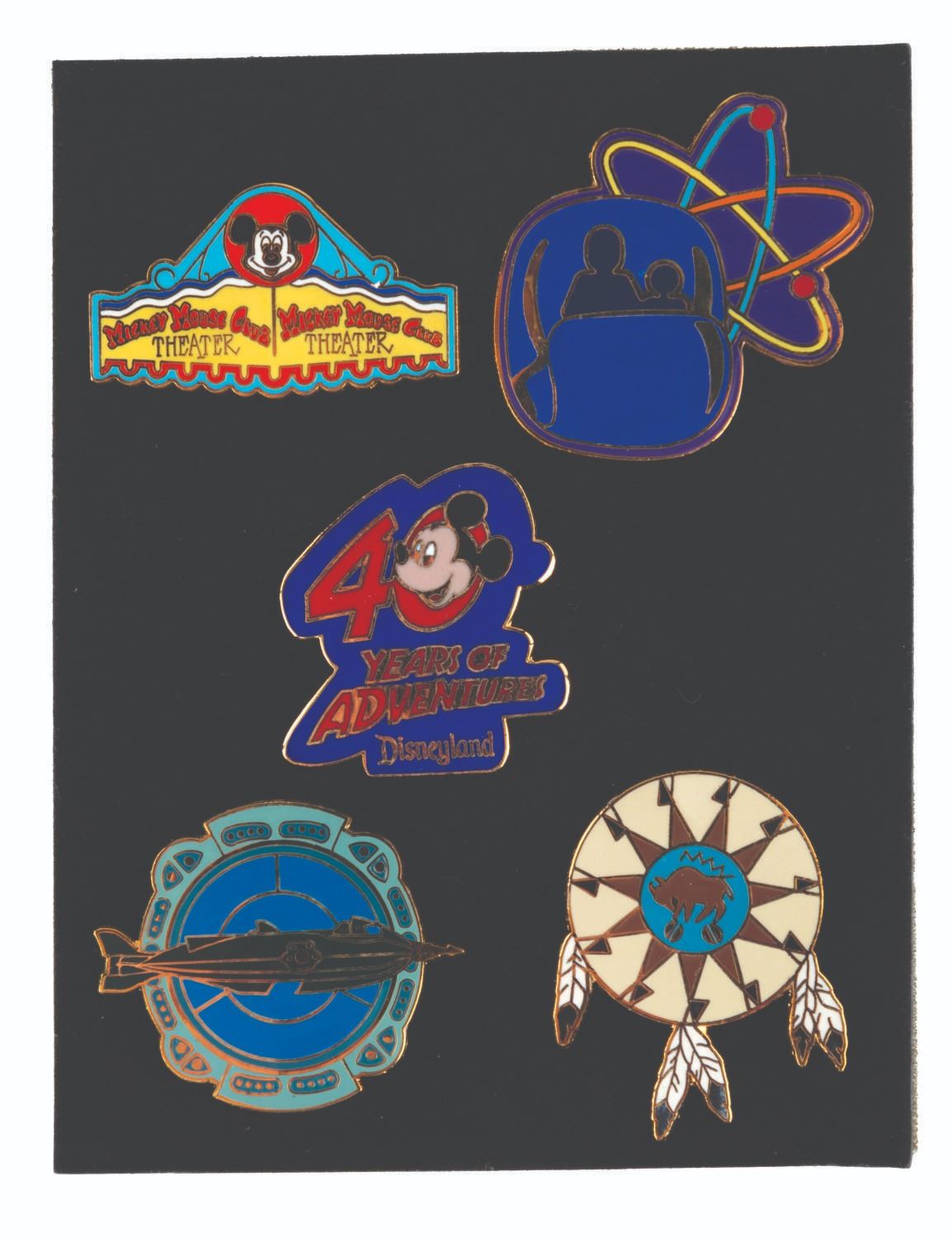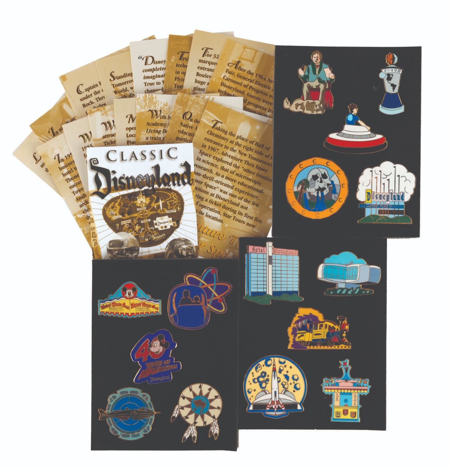 (Disneyland, 1995) A set of fifteen Cast Member-exclusive pins and sixteen Classic Disneyland cards from the Park’s 40th anniversary. Included are pins for the Mickey Mouse Club Theater, Carousel of Progress, Disneyland Hotel, Flying Saucers, and more. The pins range in size from 1” x 1.5” to 1.5” x 1.75” and the cards measure 2.5” x 3.5” each. All items are in very good to fine condition with light scratches and wear.