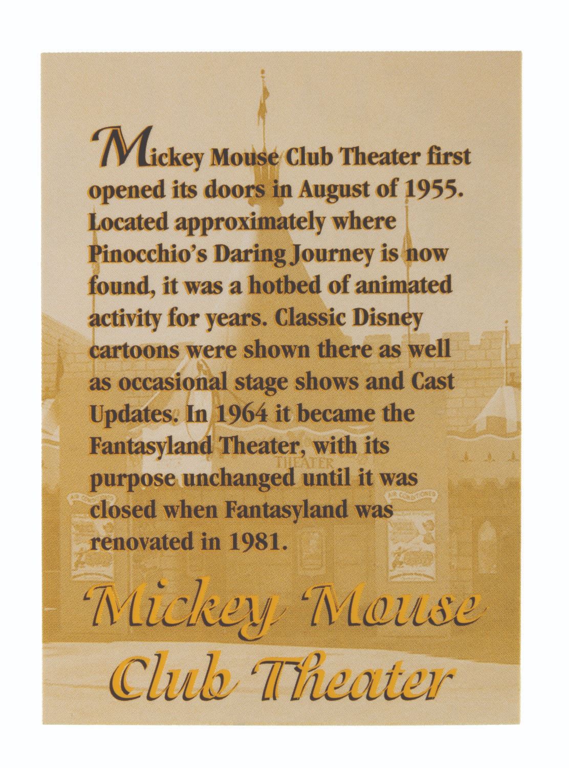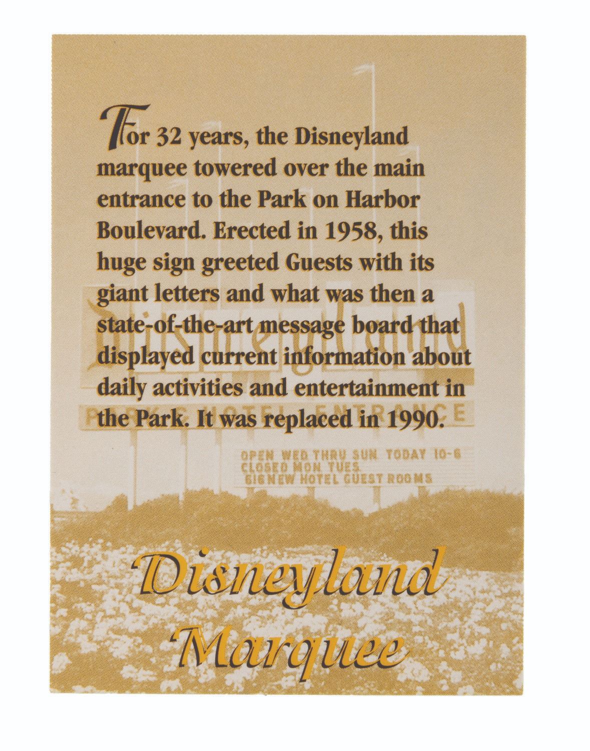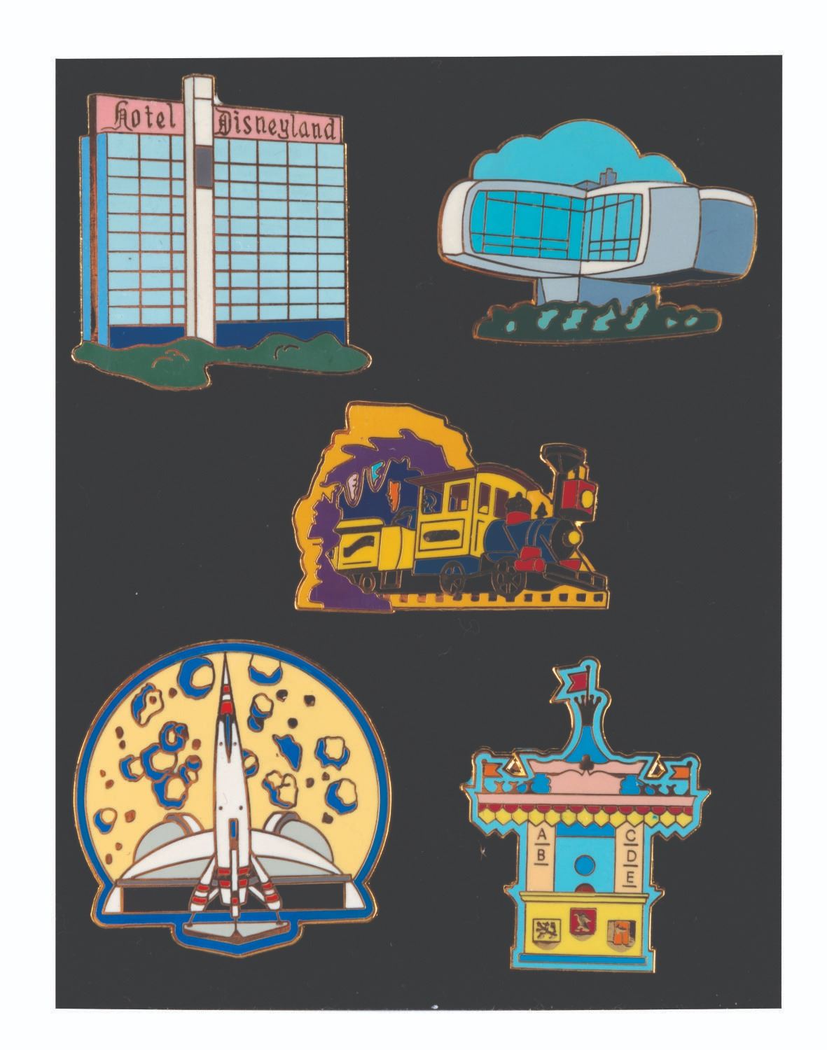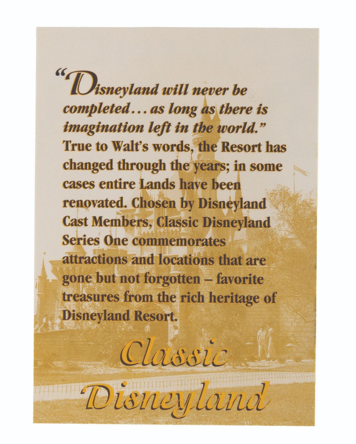 (Disneyland, 1995) A set of fifteen Cast Member-exclusive pins and sixteen Classic Disneyland cards from the Park’s 40th anniversary. Included are pins for the Mickey Mouse Club Theater, Carousel of Progress, Disneyland Hotel, Flying Saucers, and more. The pins range in size from 1” x 1.5” to 1.5” x 1.75” and the cards measure 2.5” x 3.5” each. All items are in very good to fine condition with light scratches and wear.