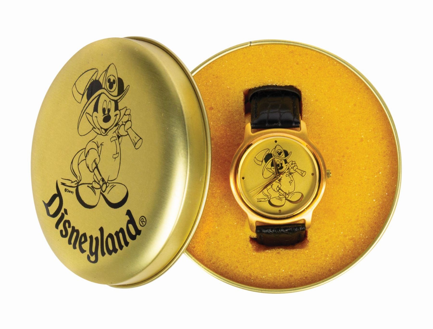 (Disneyland, c.1980s-90s) A rare cast member Disneyland Fire Department watch featuring a Firefighter Mickey Mouse on both the watch face and the lid of the protective case. The watch features a genuine leather band, and comes in its original case. It appears to be unused, and the time can still be adjusted, however functionality has not been fully tested and the watch will likely require a new battery. The watch face measures approximately 1.5" in diameter and the band measures 9.5" long.