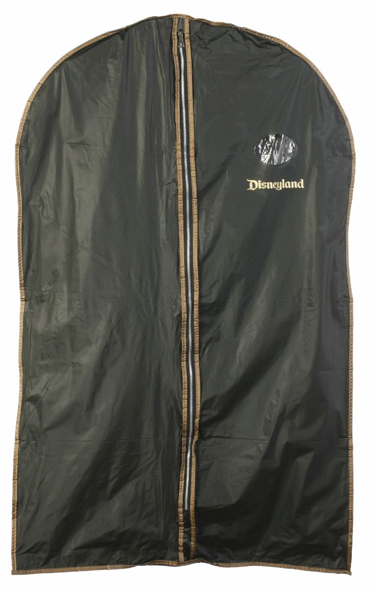 (Disneyland, 1980s) Original Disneyland garment bag used to store cast member attire. Black with gold trim and has a plastic window to reveal the name or patch on the clothing within. Measures approximately 39"x24". In good condition.