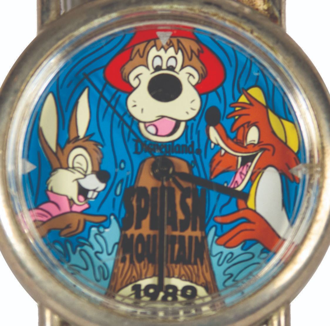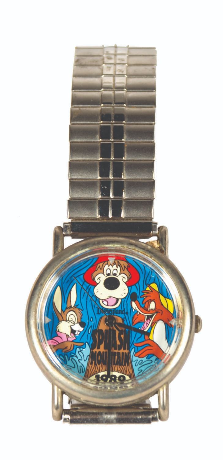 (Disneyland, 1989) A limited edition Splash Mountain wristwatch only available to Disneyland cast members. Issued to celebrate the opening of the log flume ride, this silver metal quartz movement watch at one time contained liquid to create a "splash" effect, but it has since evaporated. The reverse of the case is engraved, "Limited Edition Cast Member Watch Quartz Movement Water Resistant Disney." The original leather band has been replaced with a Speidel stretch metal bracelet. The case measures approximately 1.25" in diameter, and the bracelet has a diameter of 2.5" but stretches to be adjustable in size. The condition is good, exhibiting some tarnish, handling wear, and minor soiling.