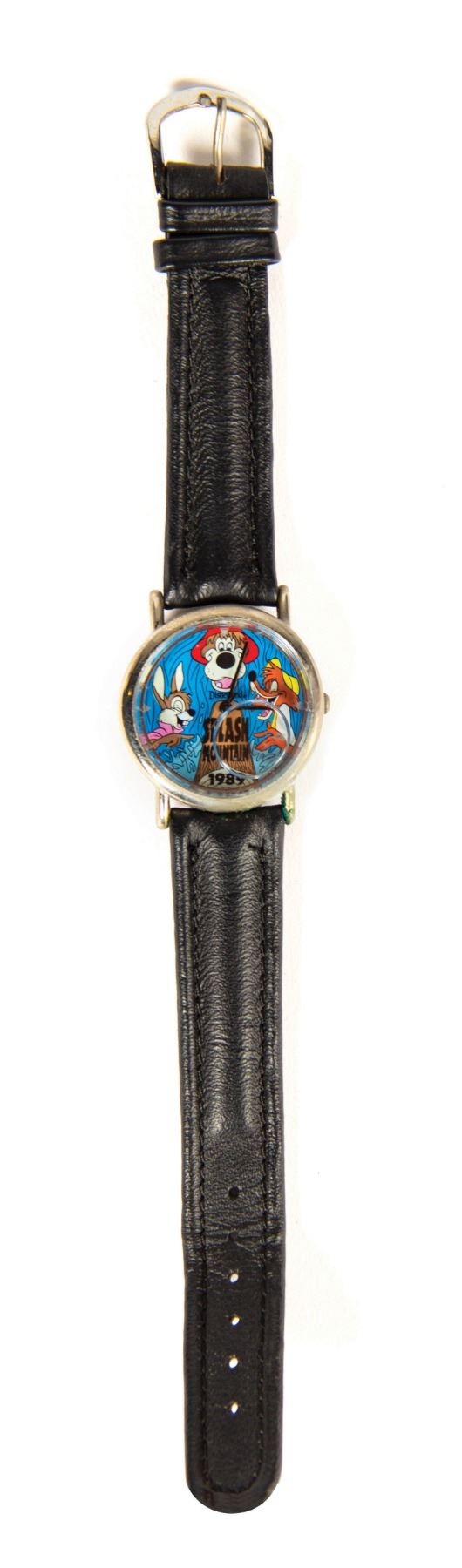 (Disneyland, 1989) A limited edition Splash Mountain wristwatch provided exclusively to Disneyland cast members. Issued to celebrate the opening of the attraction, the case contains translucent liquid, creating a "splash" effect as if the wearer has been soaked on the ride. The reverse of the case is engraved, "Limited Edition Cast Member Watch Quartz Movement Water Resistant Disney." The case measures approximately 1.25" in diameter and the black leather band measures 9" extended. The watch is in good condition, exhibiting some tarnish and handling wear and the band is creased from park wear.