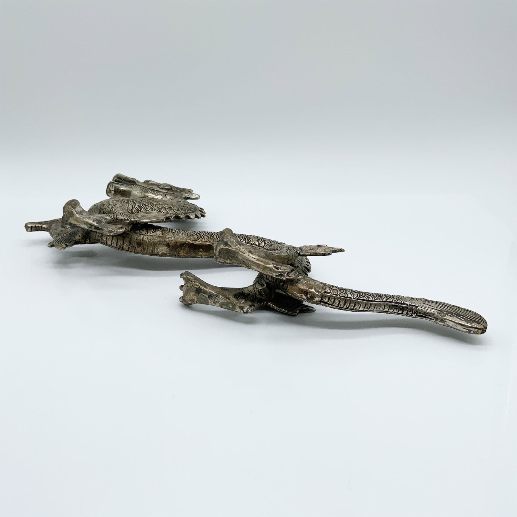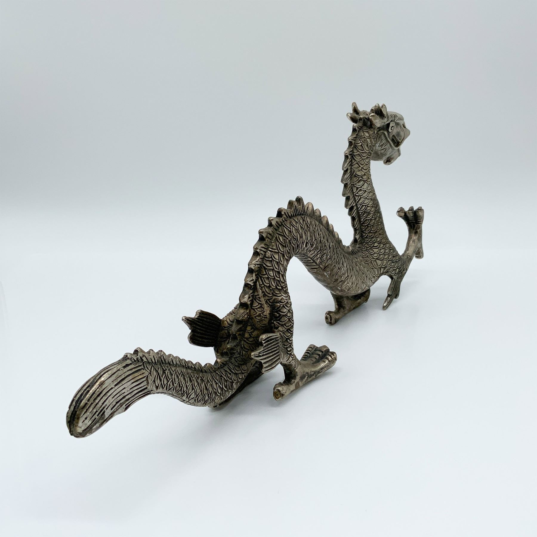 A cast metal dragon figurine featuring intricate scales, a fierce expression, and a curved body. This detailed piece symbolizes strength and protection and stands 5.5 inches tall, making it a striking display item.